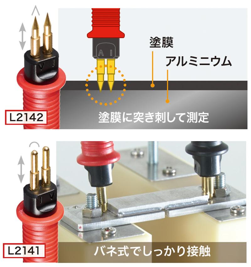 ・L2141, L2142:航空機の整備やオーバーホール工程に最適なRM3548-50は、さまざまな箇所の抵抗差をチェックする等電位ボンディング試験に適しています。先端が丸みを帯びたピン形プローブ L2141を使用すれば、航空機本体を傷つけることなく抵抗値を測定できます。
