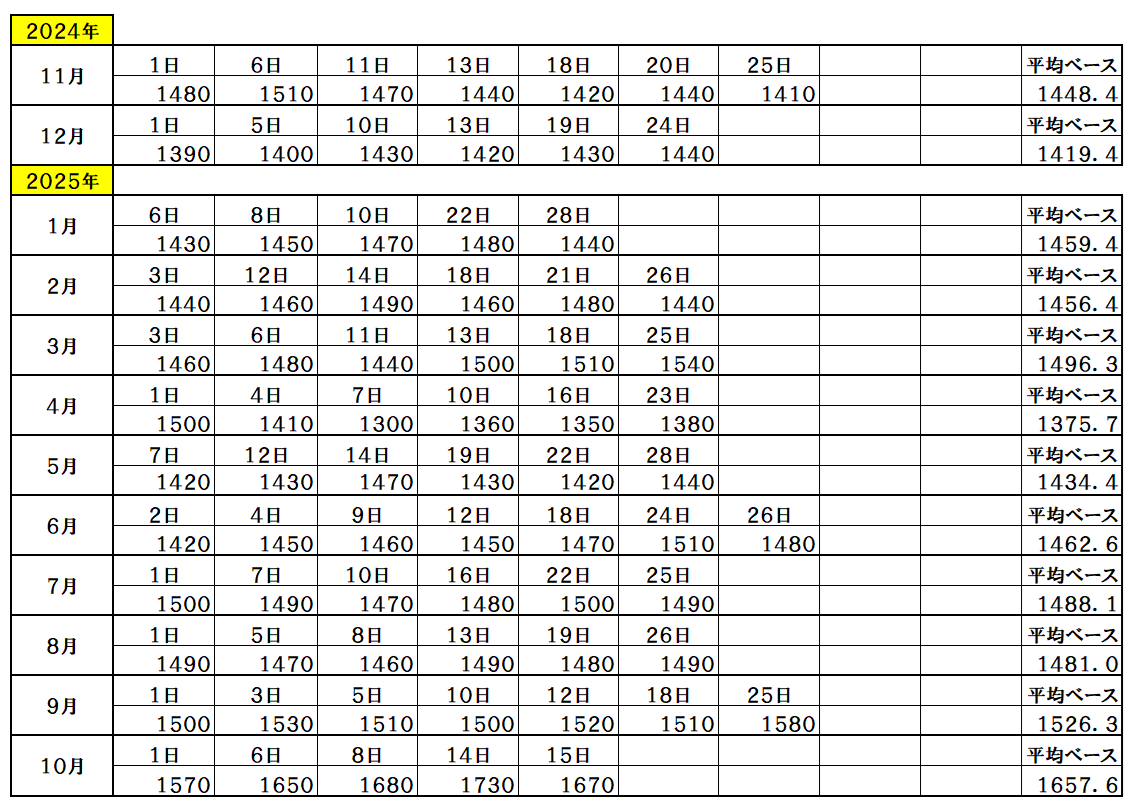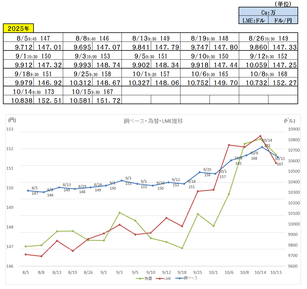 『2025年10月15日~』 銅ベース・銅建値 1670ベース (単位:千円/t) 2025/10/15 ・ 銅ベース(銅建値)情報 2025年10月15日~ 1670ベース(単位:千円/t) 銅建値はロンドン金属取引所(通商LME)が発表する銅の取引価格を元に決定。 新着情報更新↓