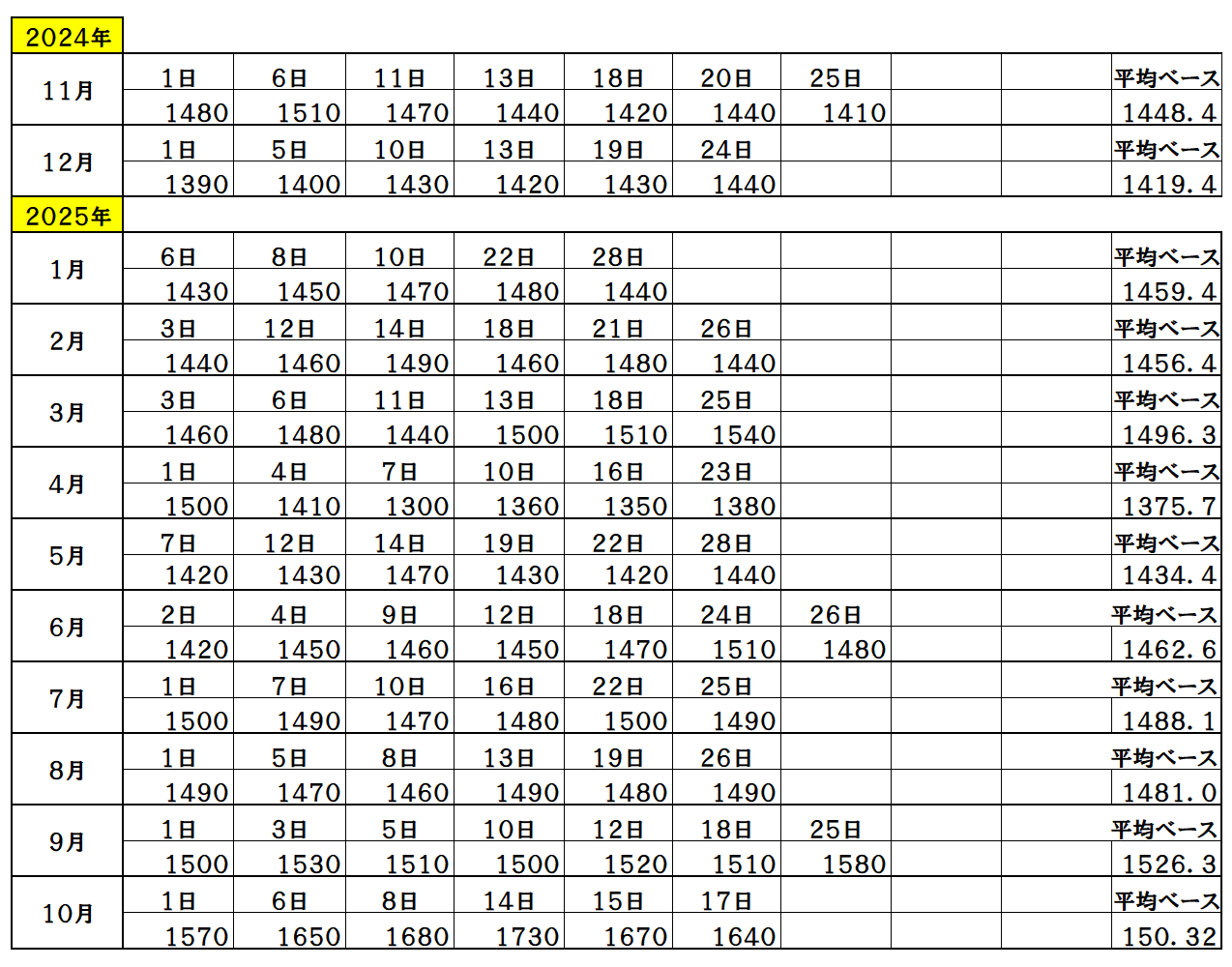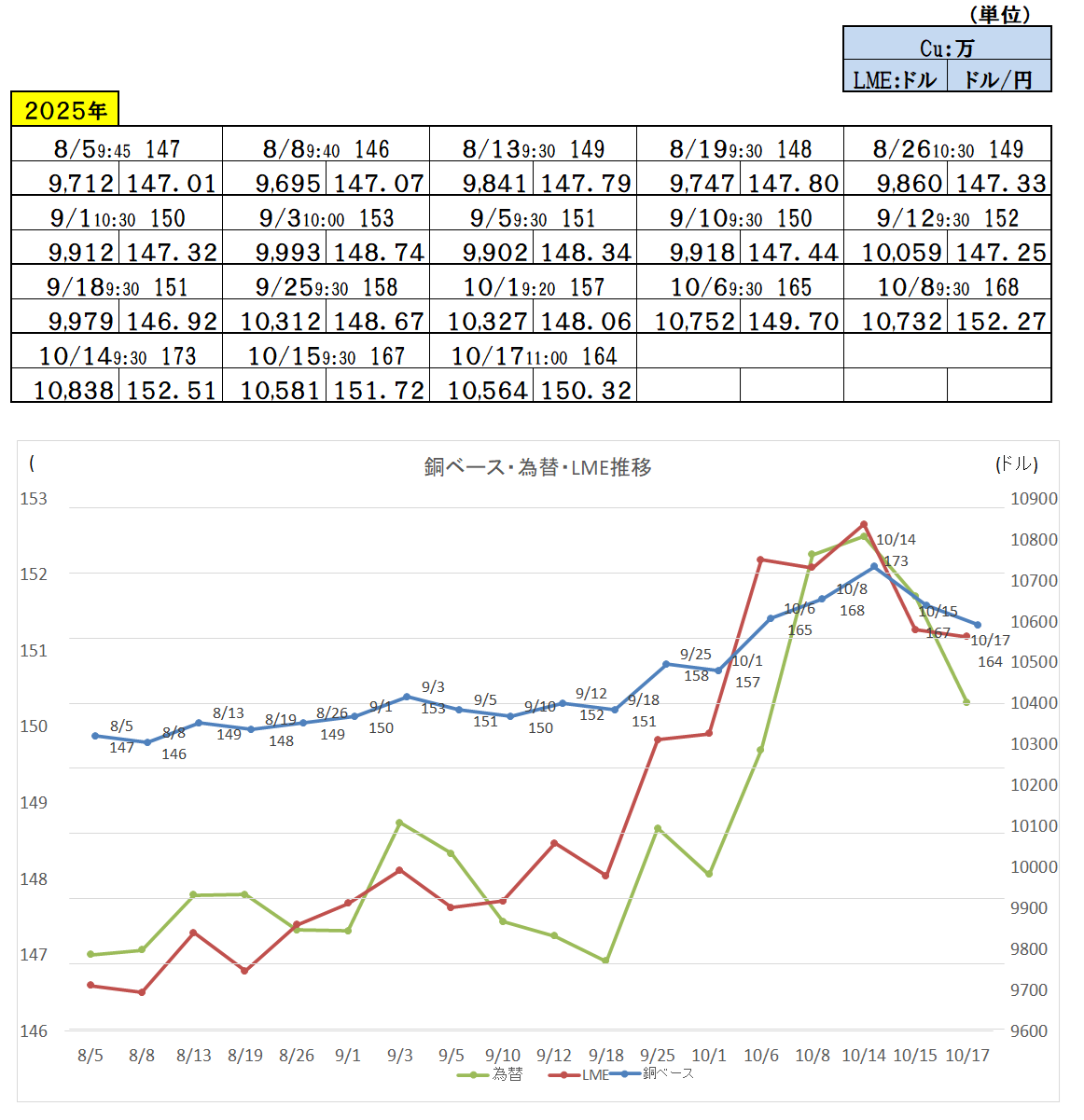 『2025年10月17日~』 銅ベース・銅建値 1640ベース (単位:千円/t) 2025/10/17 ・ 銅ベース(銅建値)情報 2025年10月17日~ 1640ベース(単位:千円/t) 銅建値はロンドン金属取引所(通商LME)が発表する銅の取引価格を元に決定。 新着情報更新↓