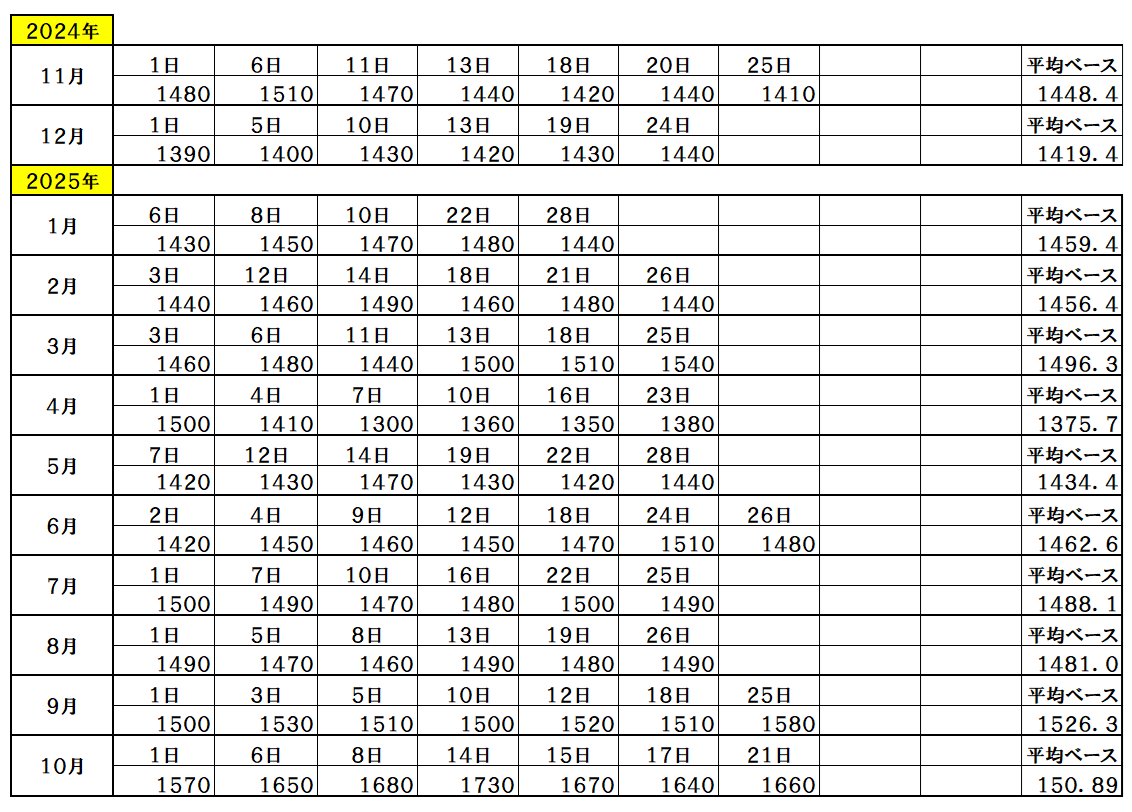 2025年10月21日~ 1660ベース(単位:千円/t)