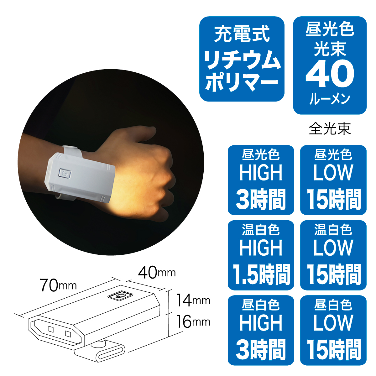 ・ライトの向きを自由に変えられる■ 仕様・本体サイズ・質量(リストバンド含む):70mm×45mm×75mm・43g