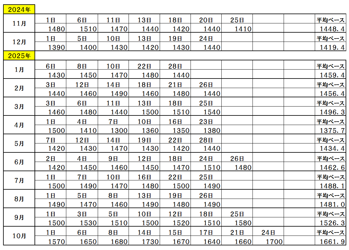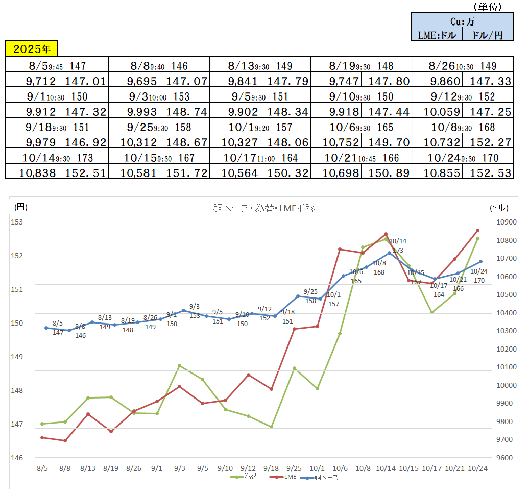 『2025年10月24日~』 銅ベース・銅建値 1700ベース (単位:千円/t) 2025/10/27 ・ 銅ベース(銅建値)情報 2025年10月24日~ 1700ベース(単位:千円/t) 銅建値はロンドン金属取引所(通商LME)が発表する銅の取引価格を元に決定。 新着情報更新↓
