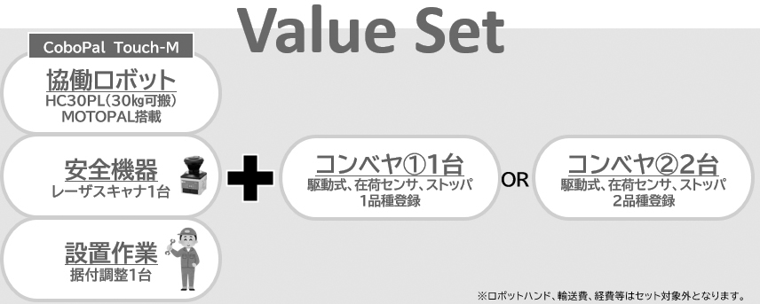 協働ロボット(HC30PL/30kg可搬、MOTOPAL搭載)、安全機器(レーザスキャナ1台)、設置作業(据置調整1台)に、コンベヤをセットにしたパッケージで、コンベヤは駆動式、在荷センサ、ストッパの中から1台または2台を選択できる。ロボットハンド、輸送費、経費などはセット対象外となる。パレタイズに必要な機能をパッケージ化したことで、ユーザはコストを抑えて導入できる。