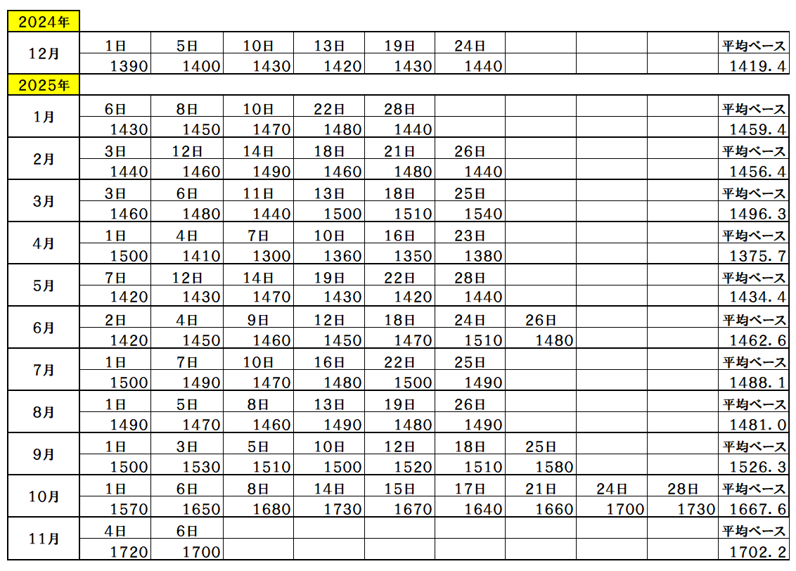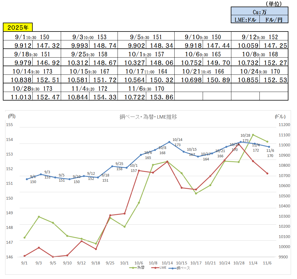 『2025年11月6日~』 銅ベース・銅建値 1700ベース (単位:千円/t) 2025/11/6 ・ 銅ベース(銅建値)情報 2025年11月6日~ 1700ベース(単位:千円/t) 銅建値はロンドン金属取引所(通商LME)が発表する銅の取引価格を元に決定。 新着情報更新↓
