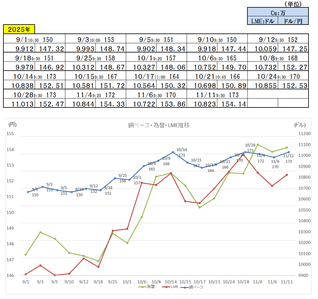 『2025年11月11日~』 銅ベース・銅建値 1730ベース (単位:千円/t) 2025/11/11 ・ 銅ベース(銅建値)情報 2025年11月11日~ 1730ベース(単位:千円/t) 銅建値はロンドン金属取引所(通商LME)が発表する銅の取引価格を元に決定。 新着情報更新↓