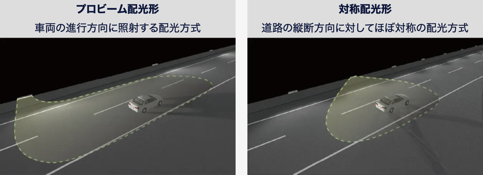 プロビーム配光形:先行車の背面を照らし、前方の車の視認性を向上させ、より安全な走行を支援します。