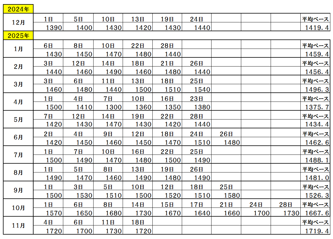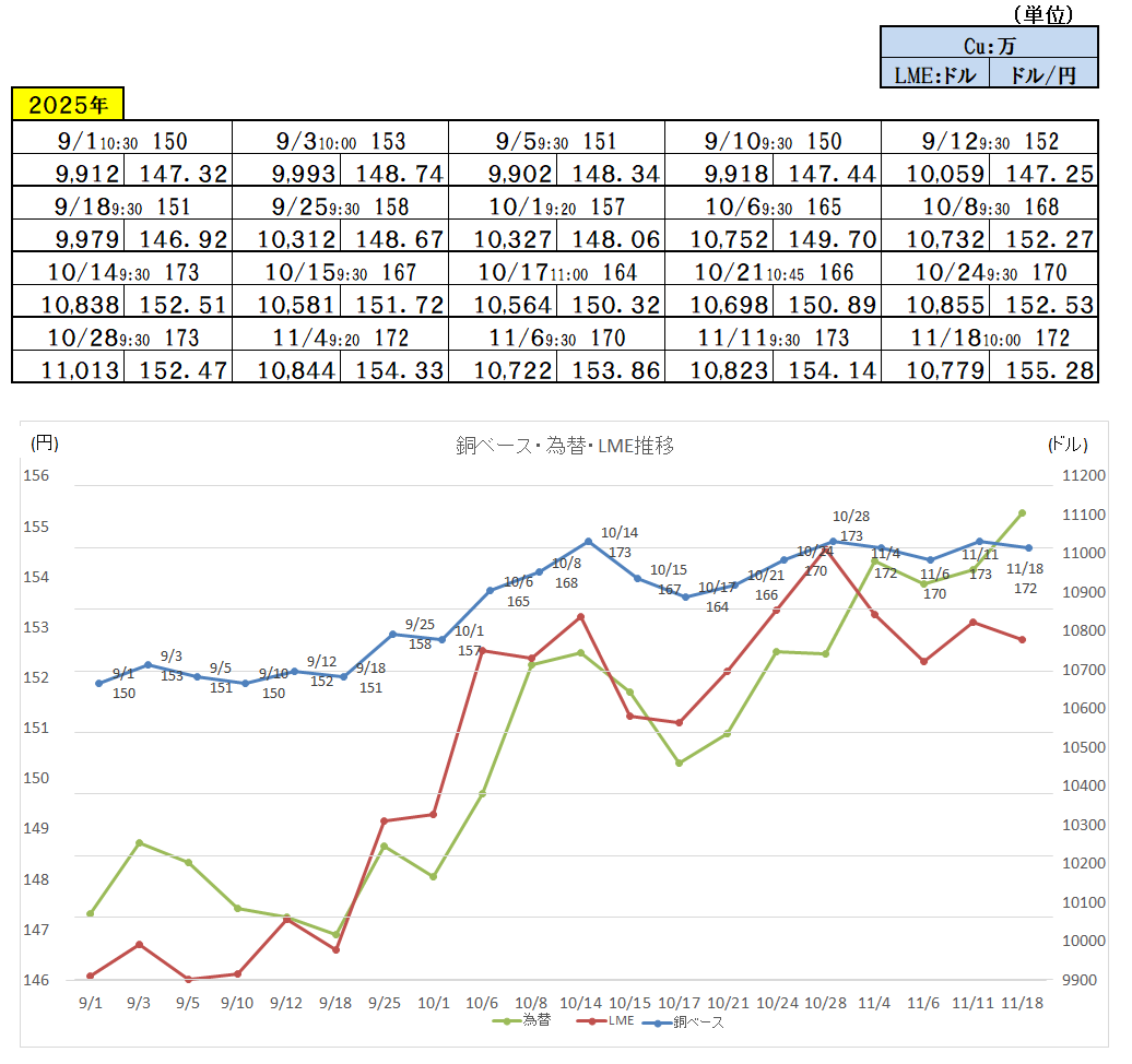 『2025年11月18日~』 銅ベース・銅建値 1720ベース (単位:千円/t) 2025/11/18 ・ 銅ベース(銅建値)情報 2025年11月18日~ 1720ベース(単位:千円/t) 銅建値はロンドン金属取引所(通商LME)が発表する銅の取引価格を元に決定。 新着情報更新↓