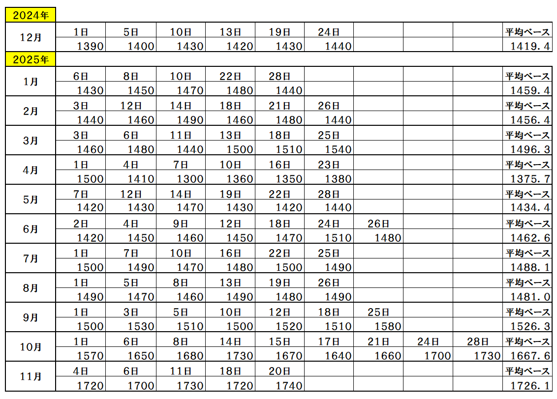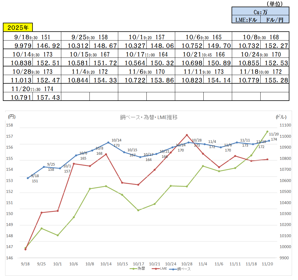 『2025年11月20日~』 銅ベース・銅建値 1740ベース (単位:千円/t) 2025/11/20 ・ 銅ベース(銅建値)情報 2025年11月20日~ 1740ベース(単位:千円/t) 銅建値はロンドン金属取引所(通商LME)が発表する銅の取引価格を元に決定。 新着情報更新↓