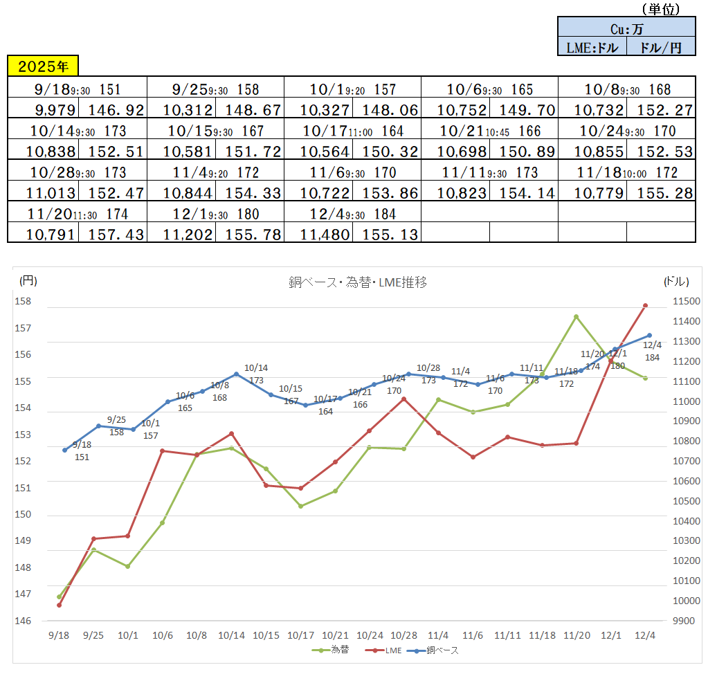 2025/12/4 ・ 銅ベース(銅建値)情報