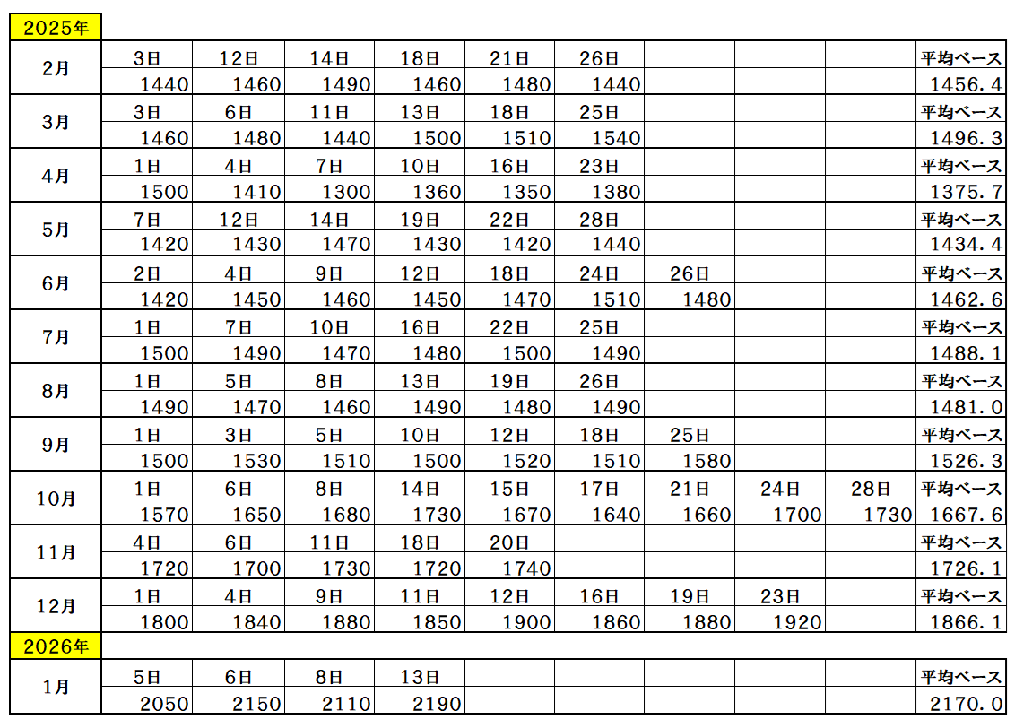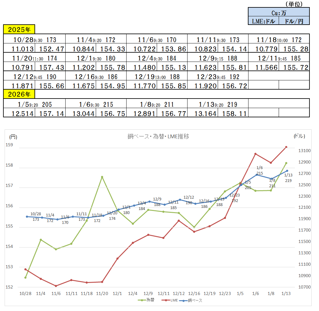 『2026年1月13日~』 銅ベース・銅建値 2190ベース (単位:千円/t) 2026/1/13 ・ 銅ベース(銅建値)情報 2026年1月13日~ 2190ベース(単位:千円/t) 銅建値はロンドン金属取引所(通商LME)が発表する銅の取引価格を元に決定。 新着情報更新↓