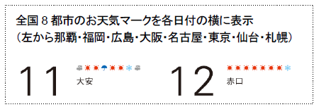 四季折々に移り変わる気候と上手に付き合って、快適な生活を送っていただきたいとの願いから、ダイキン AIR カレンダーの各日付には全国8都市の天気予測を記載しています。気象庁の過去30年分の観測データをもとに、一般財団法人日本気象協会が独自技術で解析、作成しました。