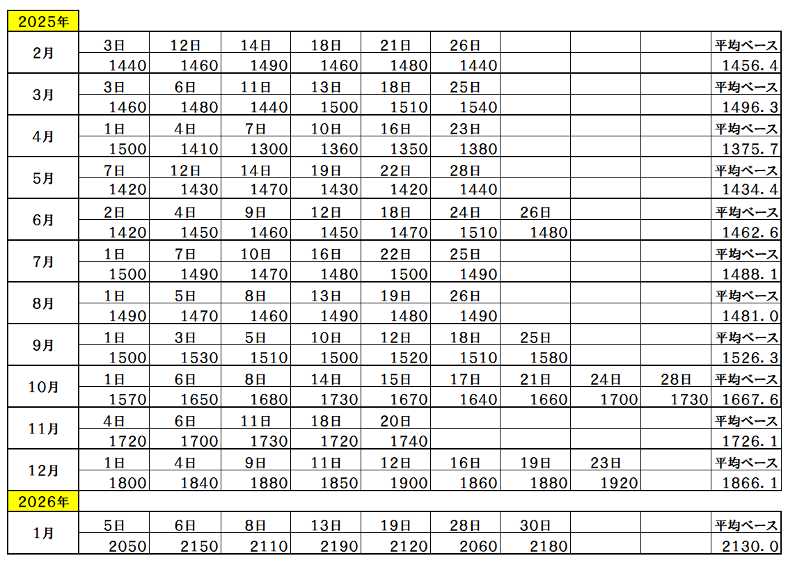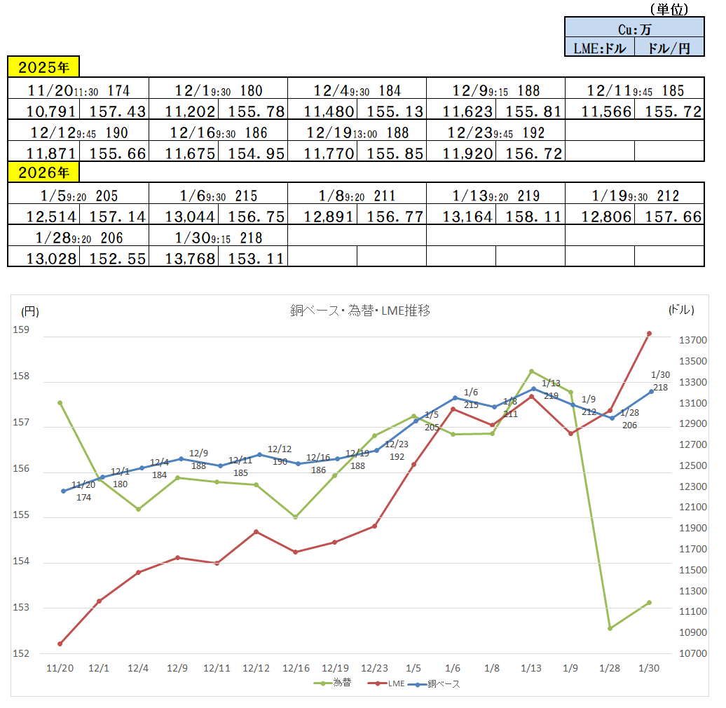 『2026年1月30日~』 銅ベース・銅建値 2180ベース (単位:千円/t) 2026/1/30 ・ 銅ベース(銅建値)情報 2026年1月30日~ 2180ベース(単位:千円/t) 銅建値はロンドン金属取引所(通商LME)が発表する銅の取引価格を元に決定。 新着情報更新↓