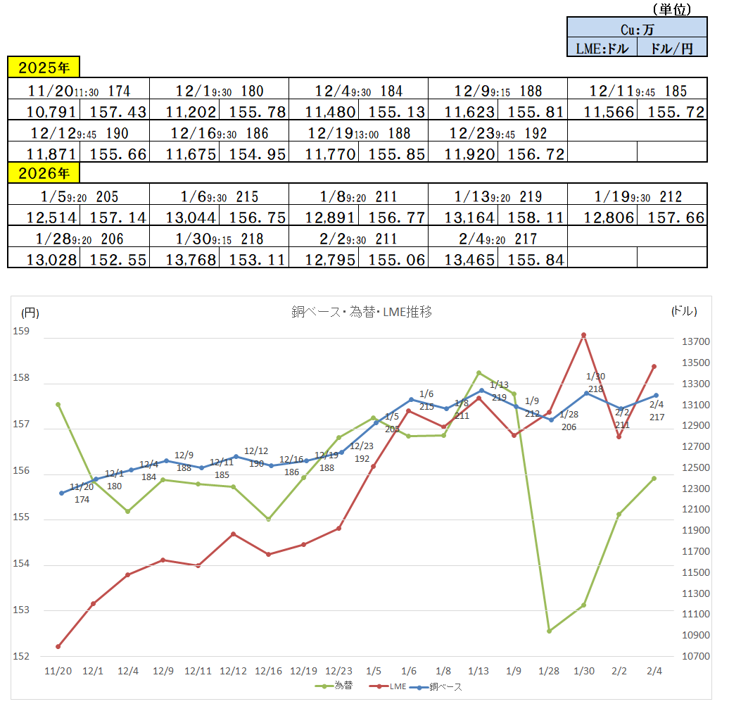 2026/2/4 ・ 銅ベース(銅建値)情報