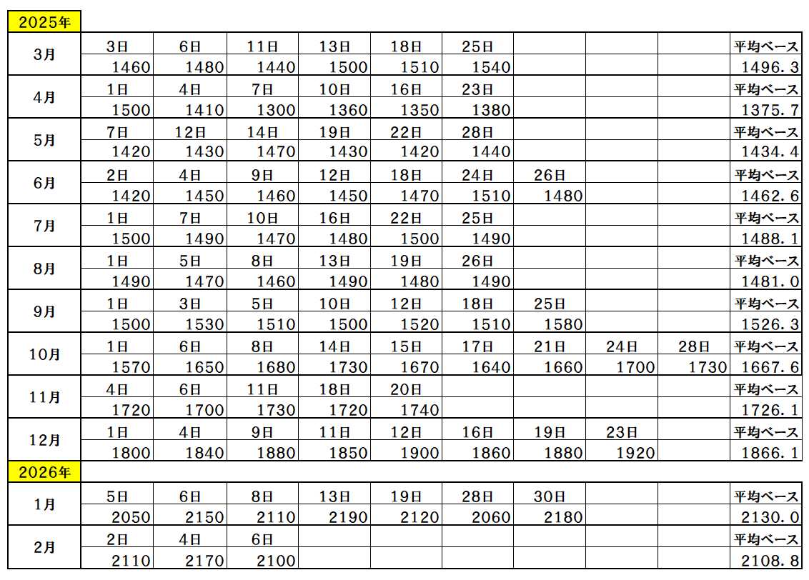 • 『2026年2月6日~』 銅ベース・銅建値 2100ベース   (単位:千円/t)
