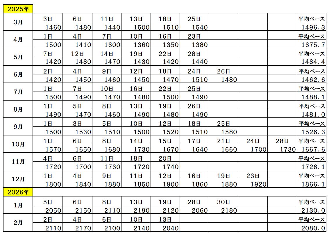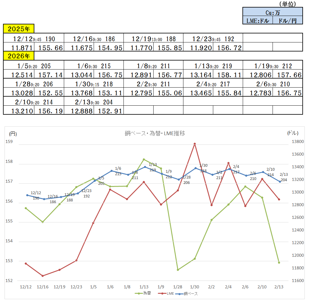 『2026年2月13日~』 銅ベース・銅建値 2040ベース (単位:千円/t) 2026/2/13 ・ 銅ベース(銅建値)情報 2026年2月13日~ 2040ベース(単位:千円/t) 銅建値はロンドン金属取引所(通商LME)が発表する銅の取引価格を元に決定。 新着情報更新↓