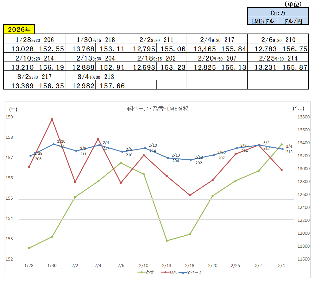 2026/3/4 ・ 銅ベース(銅建値)情報