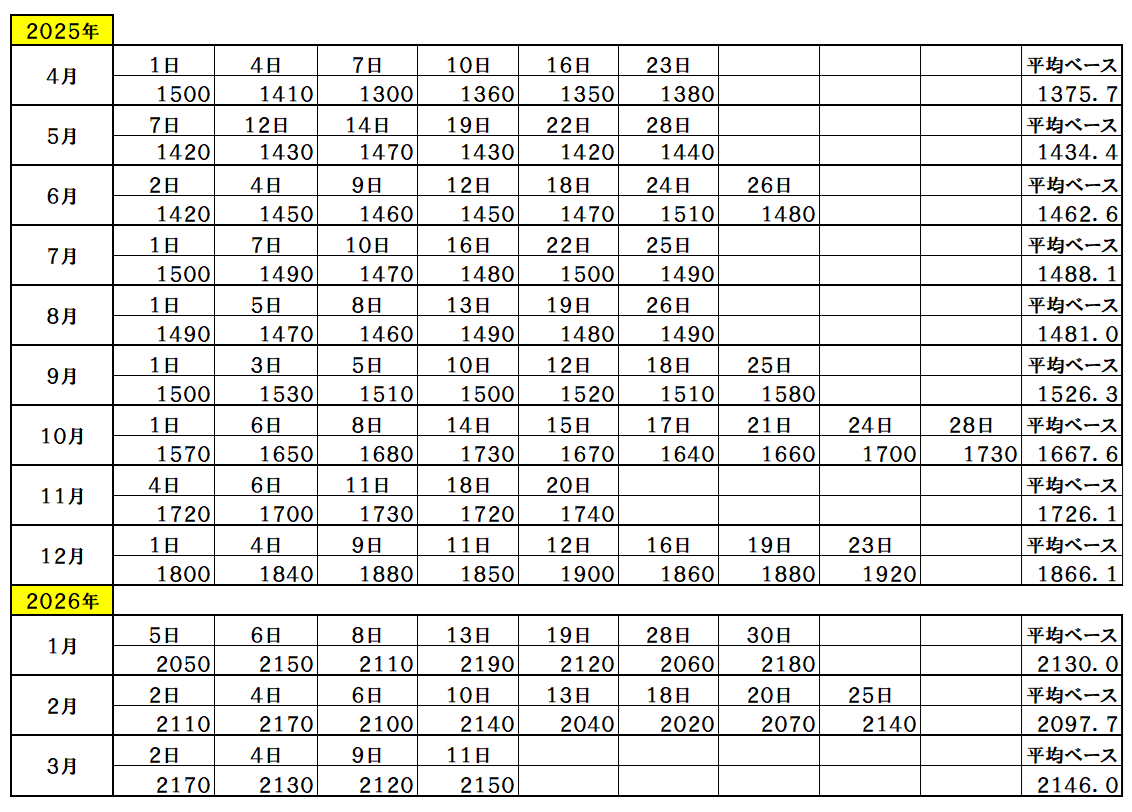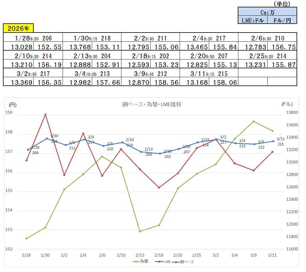 『2026年3月11日~』 銅ベース・銅建値 2150ベース (単位:千円/t) 2026/3/11 ・ 銅ベース(銅建値)情報 2026年3月11日~ 2150ベース(単位:千円/t) 銅建値はロンドン金属取引所(通商LME)が発表する銅の取引価格を元に決定。 新着情報更新↓