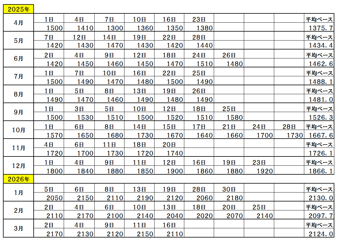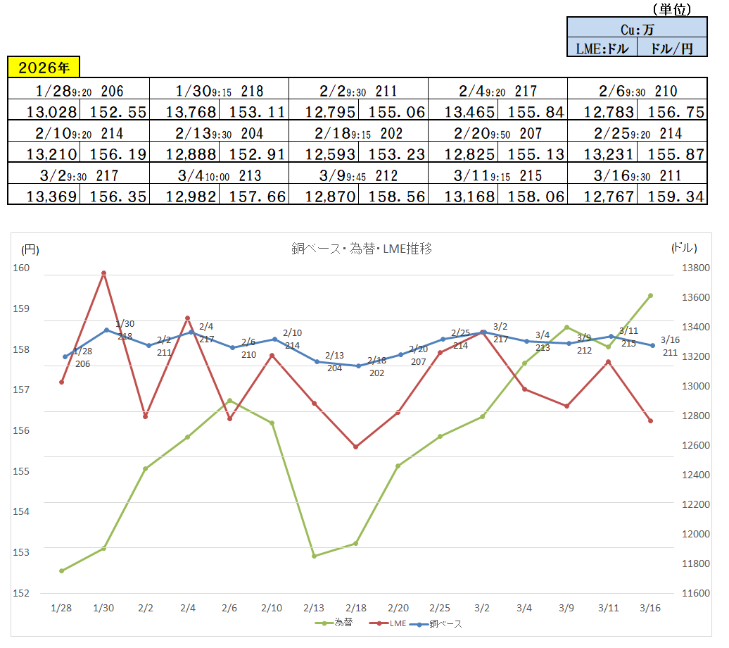 『2026年3月16日~』 銅ベース・銅建値 2110ベース (単位:千円/t) 2026/3/16 ・ 銅ベース(銅建値)情報 2026年3月16日~ 2110ベース(単位:千円/t) 銅建値はロンドン金属取引所(通商LME)が発表する銅の取引価格を元に決定。 新着情報更新↓