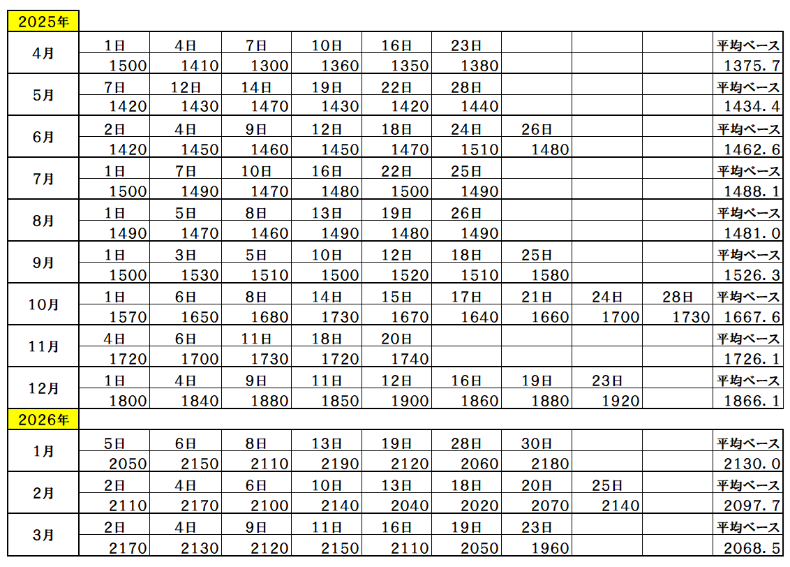 『2026年3月23日~』 銅ベース・銅建値 1960ベース (単位:千円/t) 2026/3/23 ・ 銅ベース(銅建値)情報 2026年3月23日~ 1960ベース(単位:千円/t) 銅建値はロンドン金属取引所(通商LME)が発表する銅の取引価格を元に決定。 新着情報更新↓