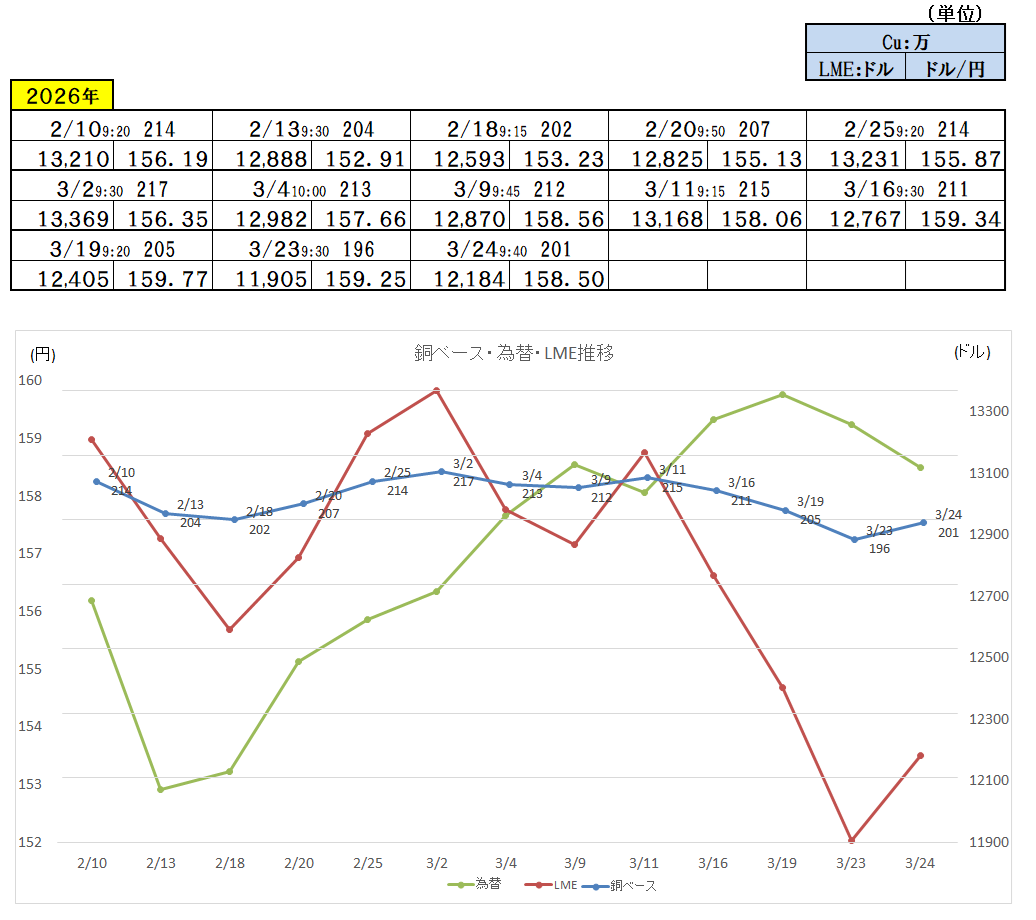 『2026年3月24日~』 銅ベース・銅建値 2010ベース (単位:千円/t) 2026/3/24 ・ 銅ベース(銅建値)情報 2026年3月24日~ 2010ベース(単位:千円/t) 銅建値はロンドン金属取引所(通商LME)が発表する銅の取引価格を元に決定。 新着情報更新↓