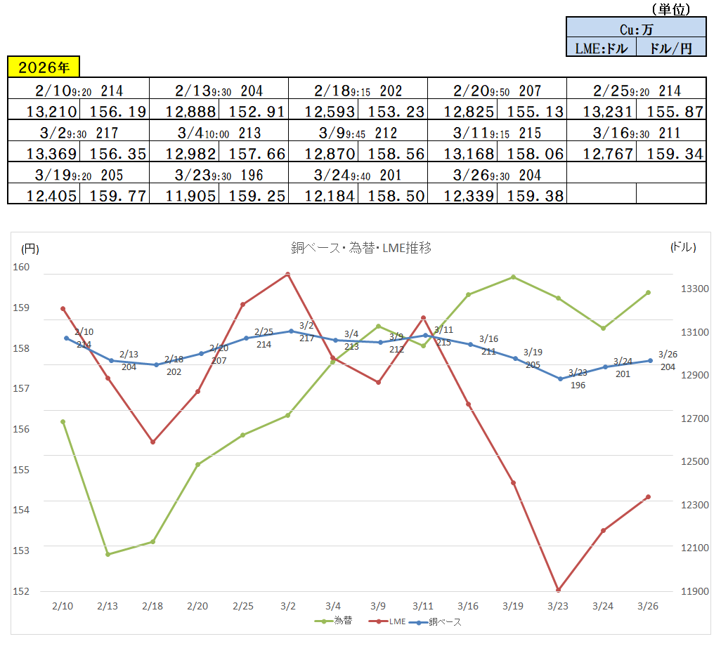 2026/3/26 ・ 銅ベース(銅建値)情報