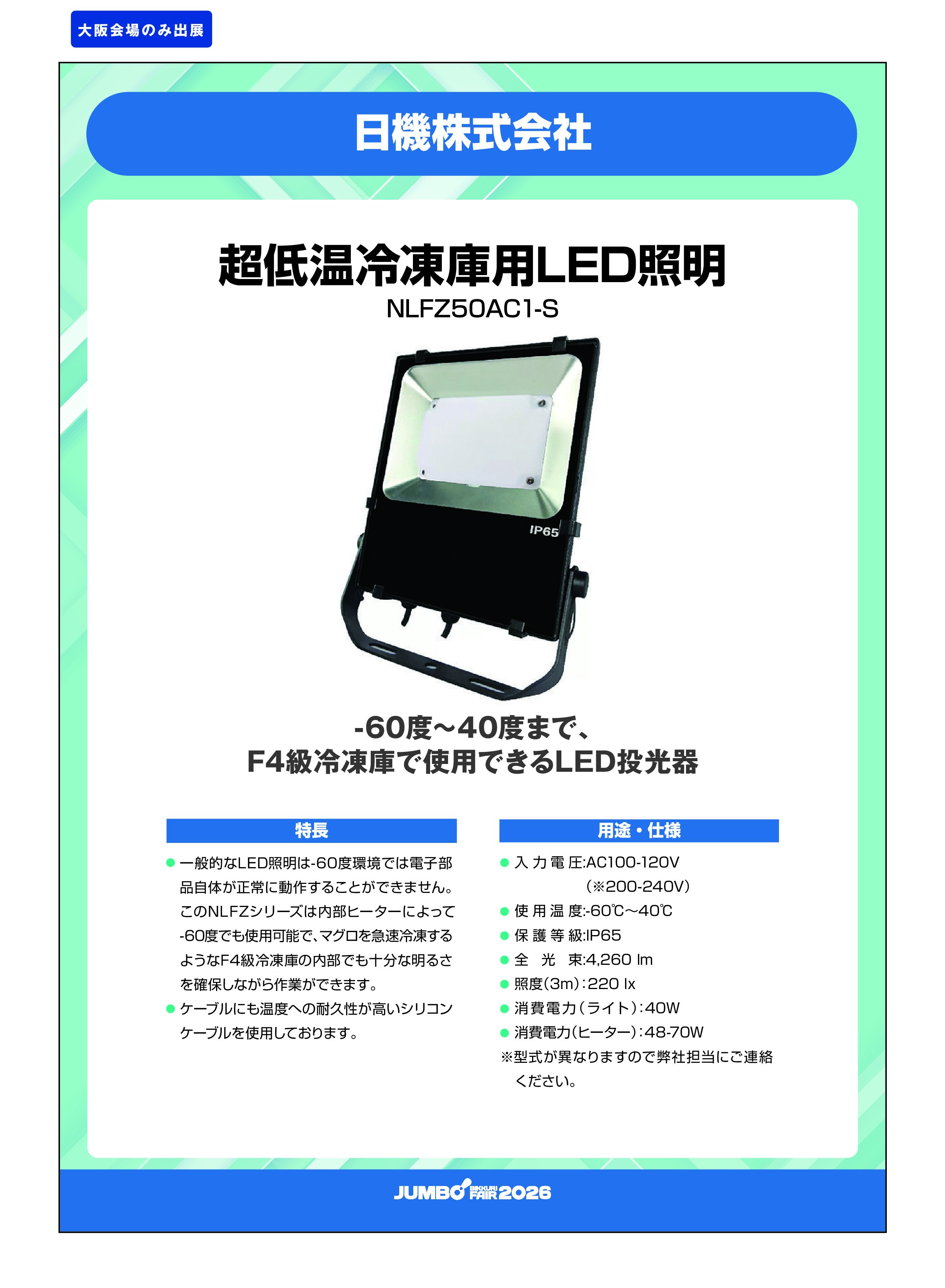 ・一般的なLED照明は-60度環境では電子部品自体が正常に動作することができません。このNLFZシリーズは内部ヒーターによって-60度でも使用可能で、マグロを急速冷凍するようなF4級冷凍庫の内部でも十分な明るさを確保しながら作業ができます。