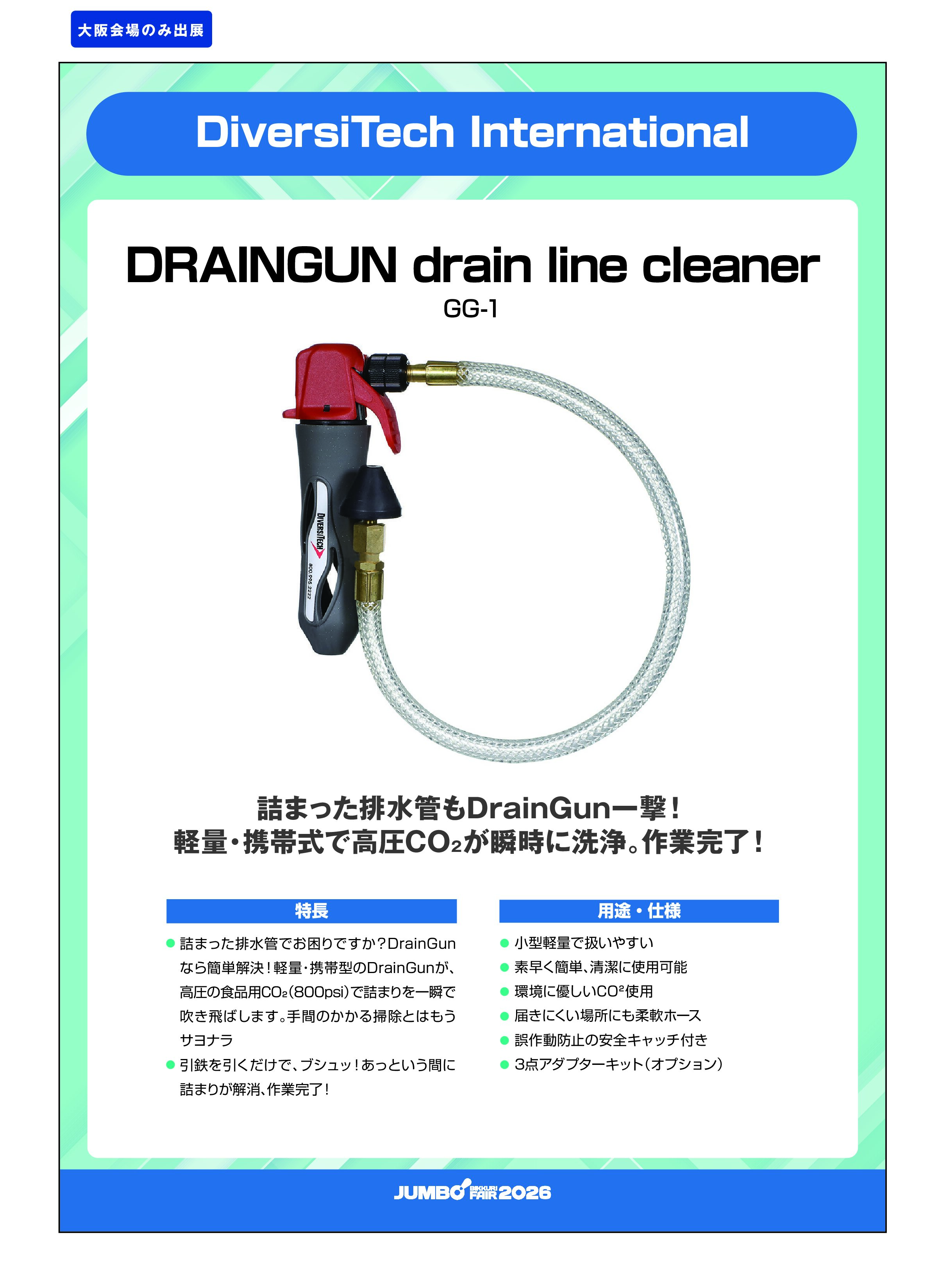 ・詰まった排水管でお困りですか?DrainGunなら簡単解決!軽量・携帯型のDrainGunが、高圧の食品用CO₂(800psi)で詰まりを一瞬で吹き飛ばします。手間のかかる掃除とはもうサヨナラ