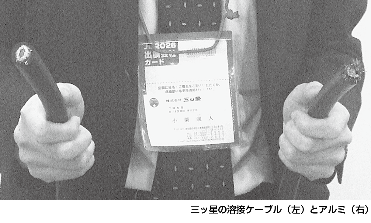 三ッ星はアルミ合金導体を使用した溶接ケーブル「ALーWCT」を紹介した。従来のWCT(銅)に比べ柔らかく、50%軽量化し溶接作業者の負担を軽減する。難燃性や耐候性も併せ持つ。