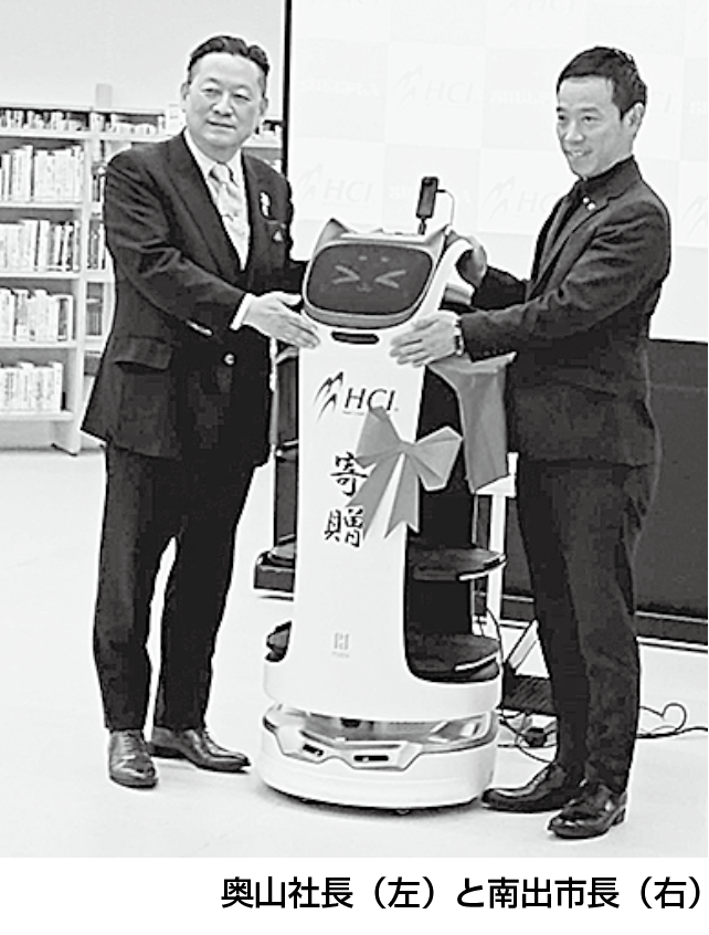 ロボットSIerのHCI(大阪府泉大津市・奥山浩司社長)は4月8日、泉大津市立図書館SHEEPLA(シープラ)において、同図書館へ配膳ロボット「ベラボット」の寄贈式を行った。HCIは、2021年に泉大津市と図書館におけるロボット活用の事業連携協定を調印しており、同年新規開設予定だったシープラでベラボットを用いた実証実験を1年間行い、その後3年にわたって同機をレンタル提供していた。